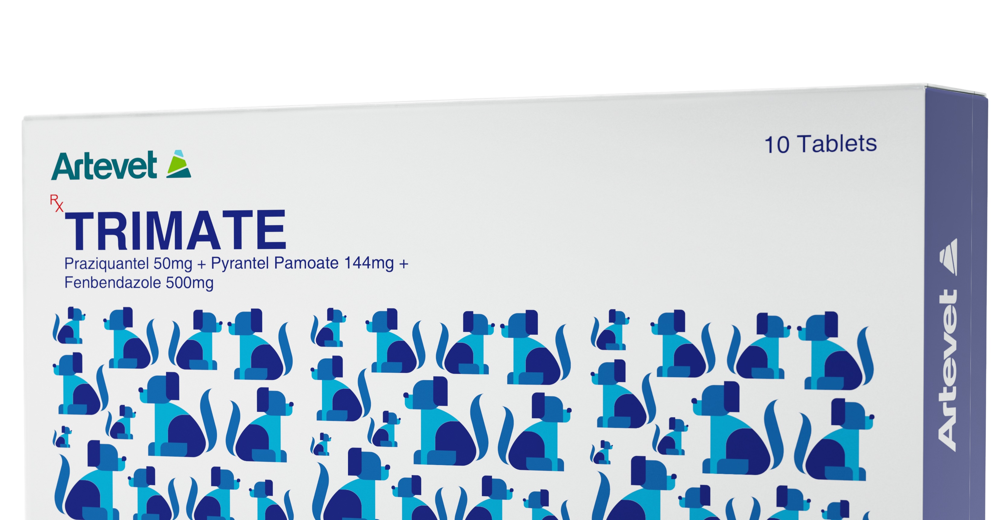 Trimate is a combination of Praziqauntel, Pyrantel pamoate and Febendazole. It is active against cestodes (tapeworms), hookworms, ascarids and nematodes including whipworms.
